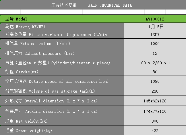 Product name:11KW 12bar AW100012 piston air compressor