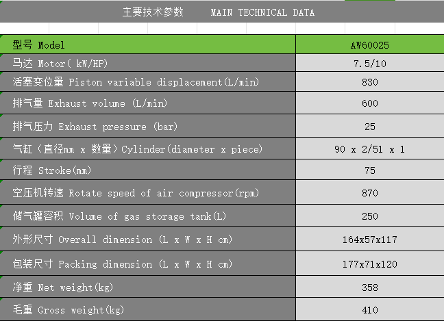 產品名稱:7.5kW 25bar 環保節能低碳活塞式空壓機(高壓機)AW60025